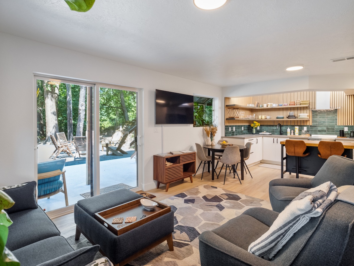 Esclusiva suite per gli ospiti in una nuova e sorprendente casa moderna nascosta tra le cime boscose delle montagne Tualatin a nord di Portland. Le vetrate incorniciano viste private sul paesaggio naturale della foresta e offrono molta luce naturale. Ingresso privato per gli ospiti, patio coperto con focolare e stile architettonico presentato nel 2020 Portland Modern Homes Tour. A pochi passi dalla nostra proprietà Nos Suenos Farm e dalle viste sulla valle del vigneto. Perfetto rifugio per single o coppie!