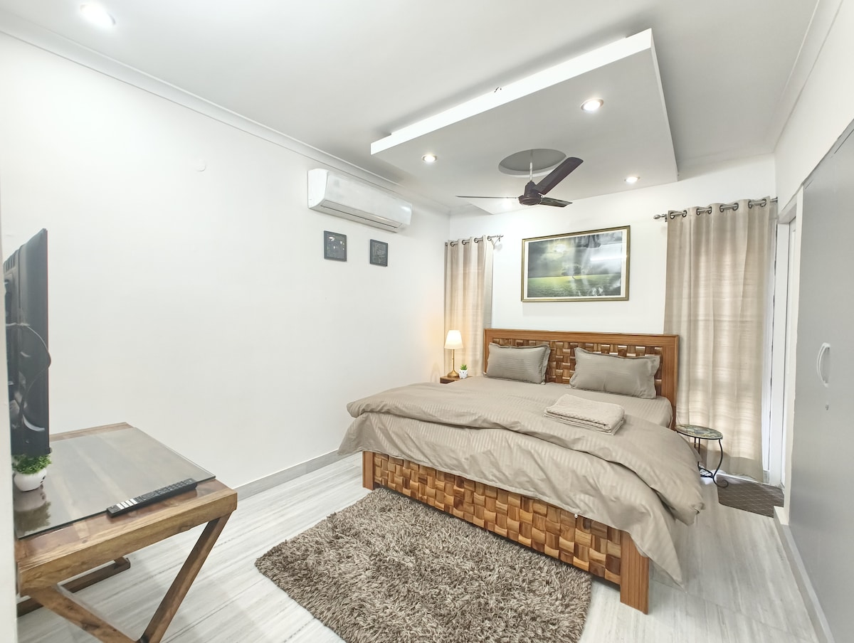 Stay at our spacious 2BR Park-View Retreat, 8.5 km from airports & 15 min ride to the metro. Enjoy airy balconies, park views, mahogany/wooden beds, a fully-equipped kitchen, high-speed Wi-Fi, Smart TV, complimentary toiletries, & local recommendations. Relish home-cooked meals, explore nearby market & malls, and unwind with serene jogging paths. Experience top-notch hospitality with flexible check-in/out, laundry services & optional airport transfers. Book now for a memorable Delhi stay!