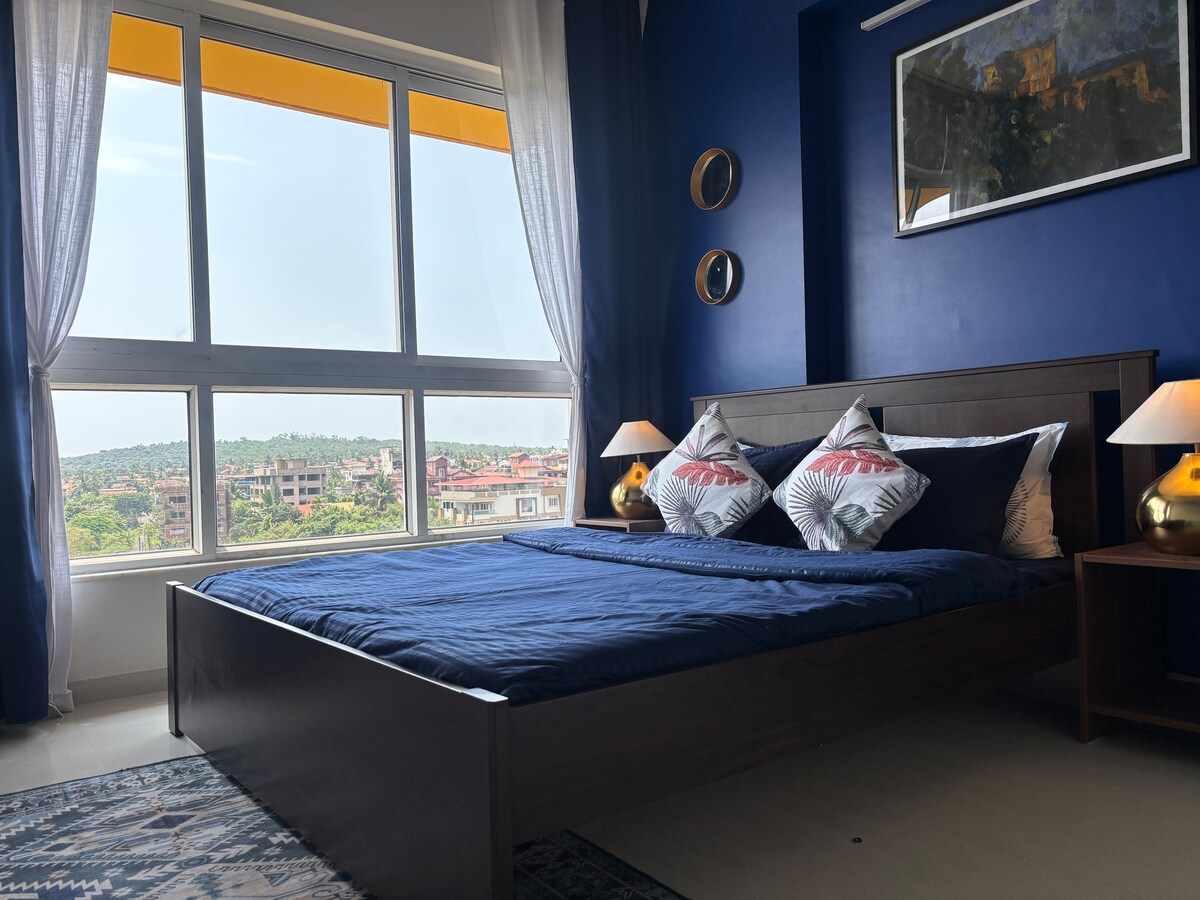 Casa vacanze con due camere da letto e aria condizionata, situata in cima alla scogliera di Dabolim, con una splendida vista sulla foce del fiume da tutte le camere. Questo gioiello nascosto vanta ampi balconi per godersi l'alba o il tramonto :) A 5 minuti dall'aeroporto! Panjim o South Goa sono a 30 minuti in auto Ben arredato e dotato di cucina completamente funzionale, RO, microonde ecc. e lavatrice Soggiorno con aria condizionata e smart TV. Accesso alla piscina principale a tutta lunghezza, alla sauna, alla palestra, al campo da squash, al tavolo da biliardo e così via. La piscina a sfioro è soggetta a restrizioni.