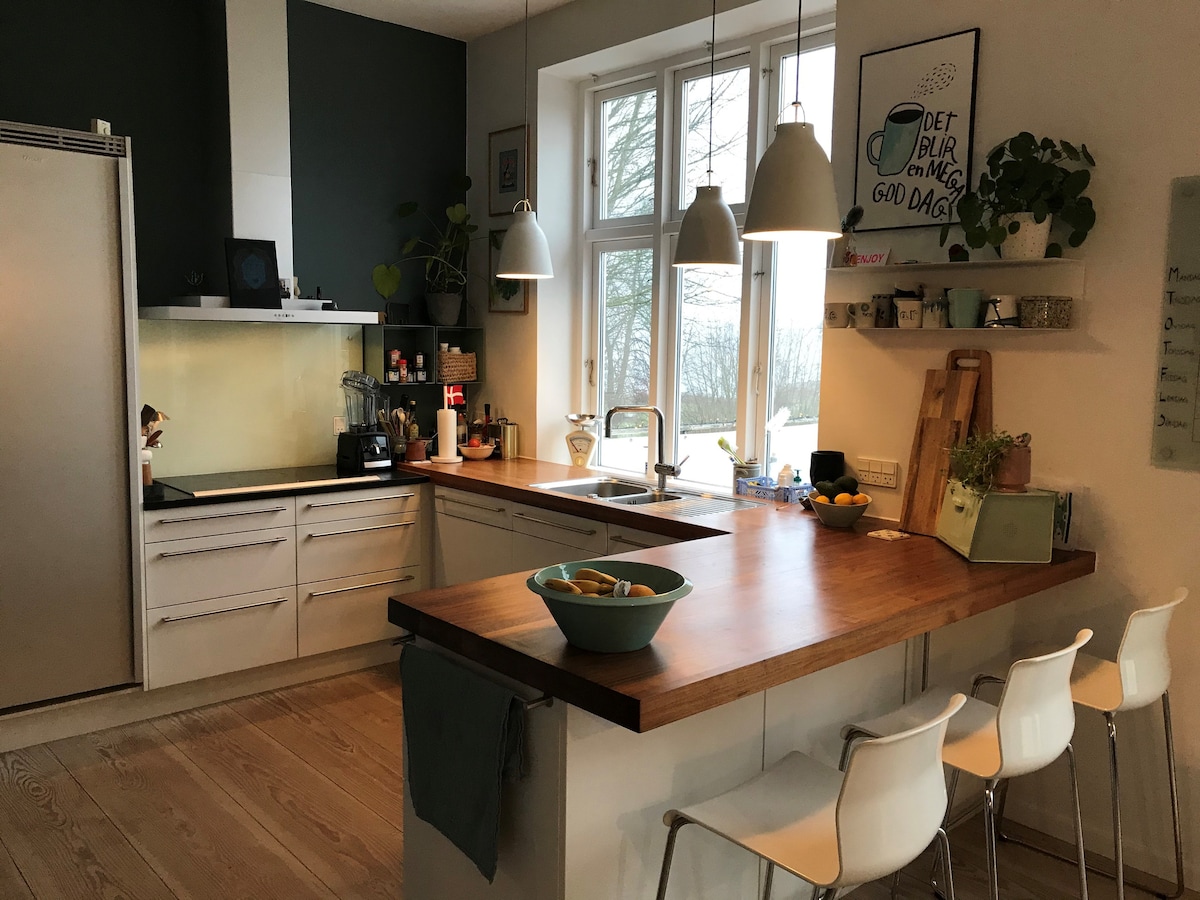 Ampio appartamento con due camere da letto, bagno privato, cucina e ampio soggiorno con zona pranzo, divano angolare e schermo piatto. Affittiamo il piano terra della nostra casa (100 mq con ingresso privato) . L'appartamento ha tutto il necessario per un soggiorno accogliente. Ci troviamo con alcune delle natura più belle dello Jutland appena fuori dalla porta e a due minuti di auto da Stilling Badesø che, con le sue acque pulite con la bandiera blu, la piccola spiaggia sabbiosa e il molo balneare, è una piccola Mecca in estate.
