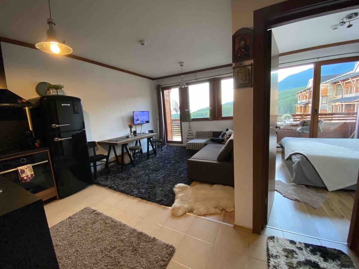 "Monolocale confortevole in affitto a Bansko, ideale per le coppie. Arredamento moderno, terrazza con vista panoramica sulle montagne e posizione rivolta a sud. Accogliente e caldo, situato in una zona tranquilla ma allo stesso tempo vicino a tutti i servizi, ristoranti e negozi. Perfetto sia per una vacanza sulla neve che per una vacanza estiva in montagna. Completamente attrezzato per un soggiorno confortevole in tutte le stagioni, posto auto incluso nel prezzo. Possibilità di affitto stagionale o annuale. "