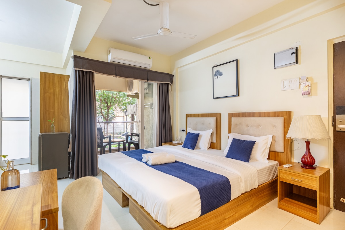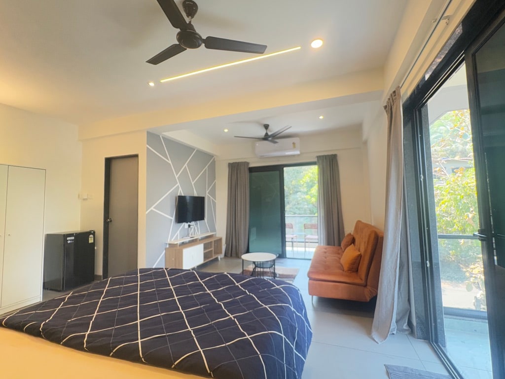Luminoso monolocale Verde con aria condizionata presso Seven Summers, Mandrem, a soli 2 minuti a piedi dalla spiaggia di Mandrem. Goditi un ampio balcone con vista sul verde lussureggiante, molta luce naturale, WiFi gratuito ad alta velocità, una cucina completamente attrezzata, un bagno privato con acqua calda e altro ancora. L'accesso al tetto offre una vista sul mare. Perfetto per chi viaggia da solo o per coppie in cerca di comfort e di un ambiente sicuro.
