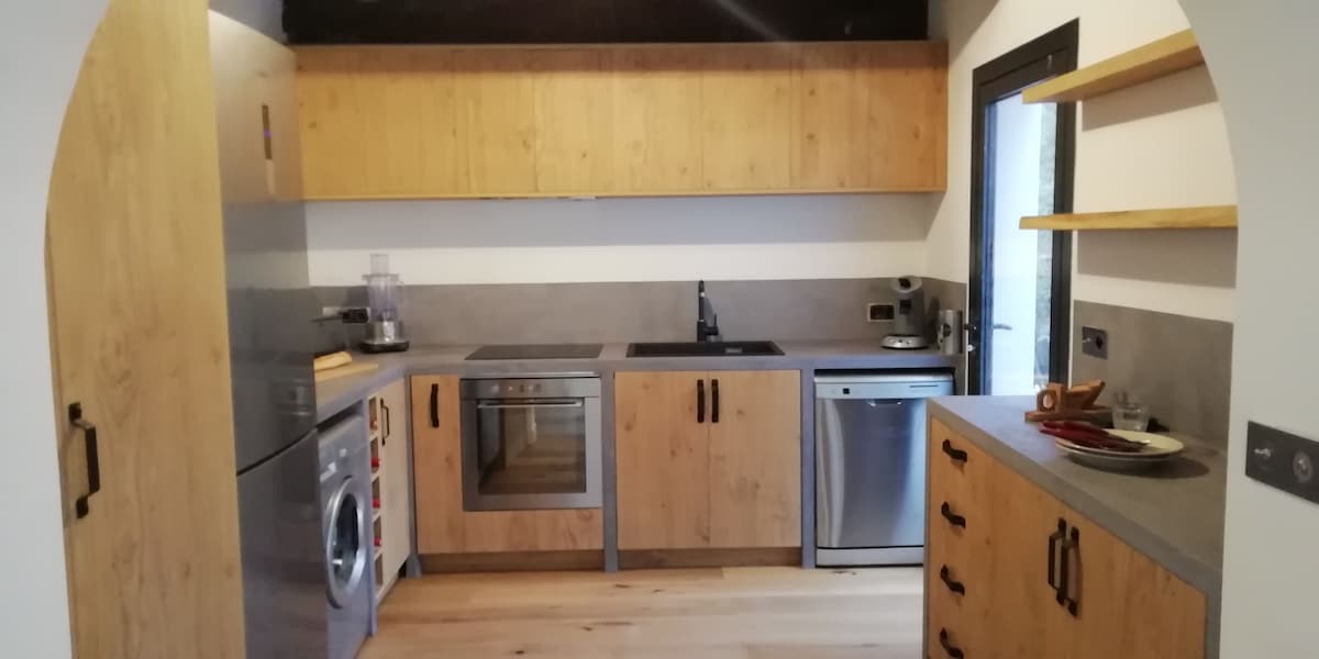 Questa casa è composta da: - una cucina attrezzata con forno, microonde, piano cottura a induzione, piccolo frigorifero, bollitore, macchina per il caffè, tostapane - un bagno con doccia, lavabo, WC, lavatrice - una zona notte 2 posti (160 x 200 cm) aperta - un soggiorno sala da pranzo e soggiorno con divano letto 2 posti - messa a disposizione se necessario di una culla Sono forniti lenzuola e asciugamani. Stufa a legna e piscina. Spese di pulizia da pagare all'arrivo: 50 euro