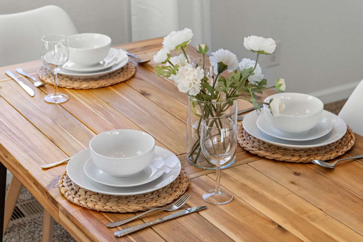 This clean, sanitized, and modern studio is perfect for all types of travelers! Precautions against Covid19. With a queen size bed that reclines, you can get the sleep you need after a day of adventure. The kitchenette is large and provides kitchen amenities and a lovely nook to enjoy eating/working/daydreaming. The bathroom is unique with a full size bath/shower and full service W/D. A walk in closet for all you fashionistas.
