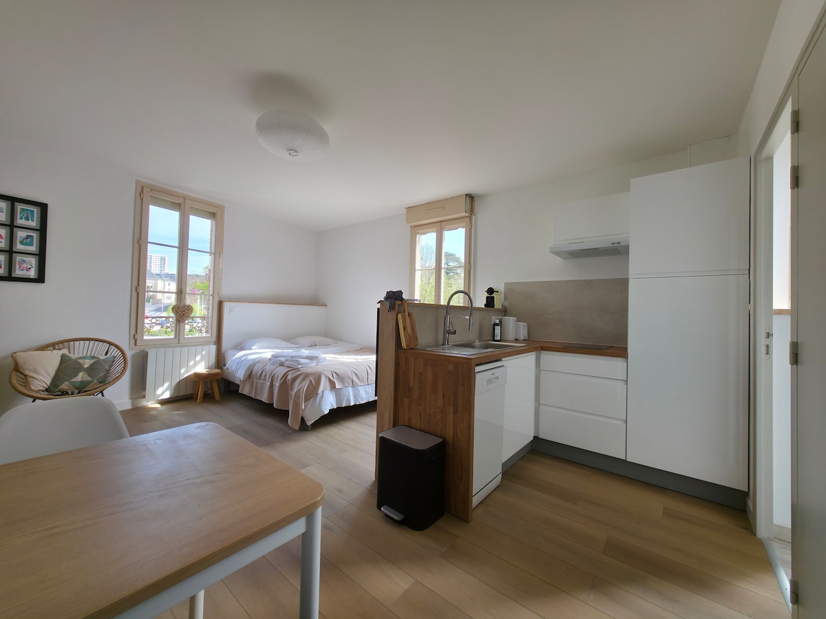 Vous disposez d' un espace entièrement privatif avec entrée indépendante, salle d'eau, cuisine équipée et bureau à l'étage. Nous mettons à votre disposition tout le nécessaire pour un petit-déjeuner. A 5mn à pied de la gare Puy du Fou à 25 mn en voiture. Parc Oriental de Maulévrier à 15 mn de trajet. Hellfest à 30 mn. J'aurai le plaisir de vous accueillir mais une boîte à clé reste disponible pour les arrivées tardives.