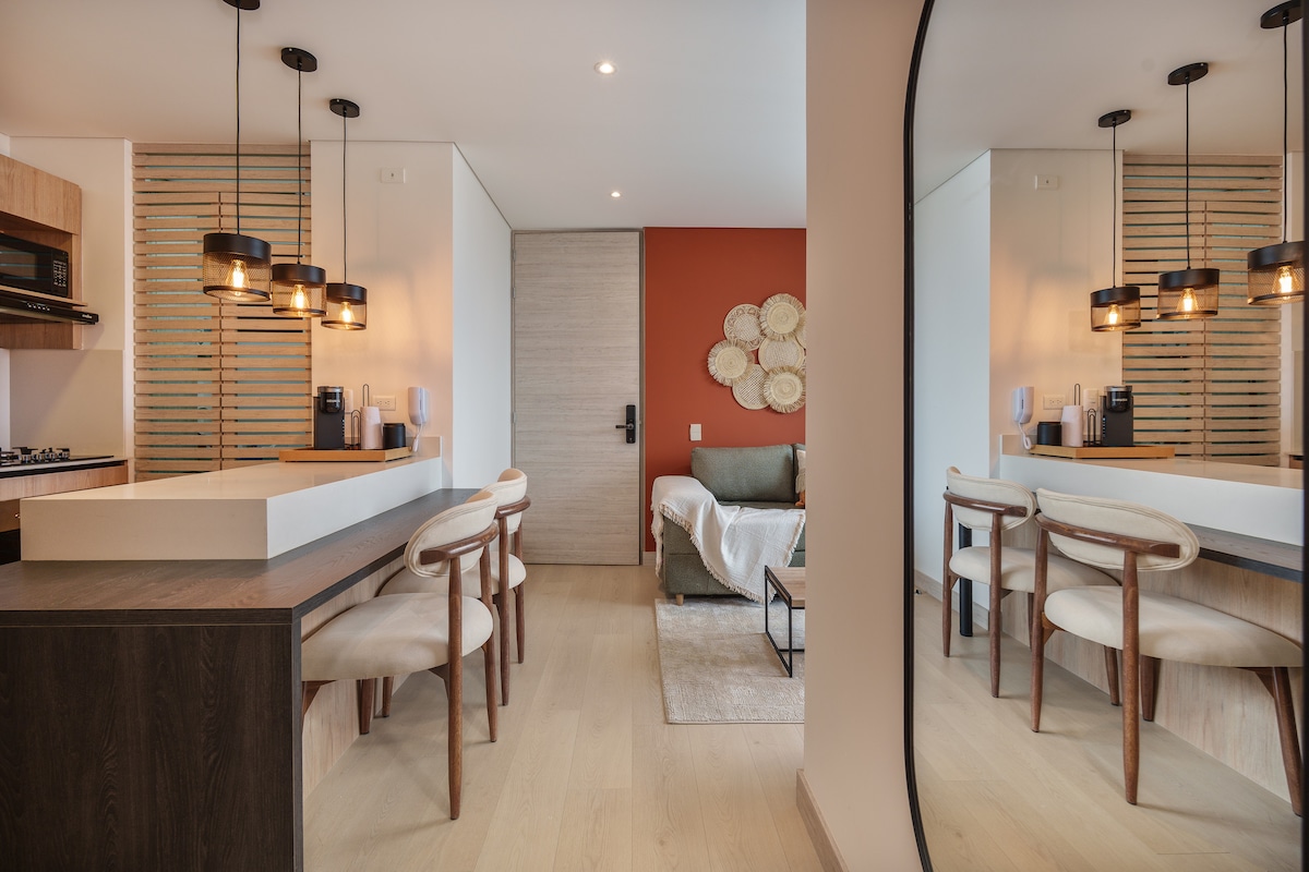 Loft di lusso di 70 m² al 9° piano dell'iconico Energy Living. Apri le nostre finestre a tutta altezza per trasformare il tuo intero spazio abitativo in un arioso rifugio all’aperto con le migliori viste sullo skyline di Medellín. Dispone di un letto king-size, due televisori da 80 pollici e un design moderno ed elegante. Goditi una piscina a sfioro sul tetto, una palestra e una vasca idromassaggio al 22° piano. Situato a 5 minuti da Provenza e El Tesoro. Sicuro, tranquillo e perfettamente collegato.