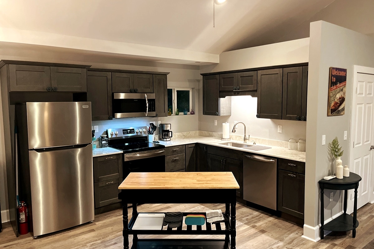 La nostra casa colonica con tre camere da letto è nascosta in un angolo tranquillo della proprietà, anche se gli ospiti godono comunque di un facile accesso a tutti i servizi del Village Inn, inclusa la sauna. Dotato di elettrodomestici in acciaio inossidabile, piani di lavoro in granito e tre camere da letto, questo è un luogo spazioso e tranquillo dove sentirsi a casa! Se non vedi l'ora di trascorrere del tempo all'aperto, c'è un portico coperto con vista sul vigneto, un patio privato in pietra e un'area salotto lungo il fiume con braciere. Vieni per un weekend o soggiorni per una settimana!