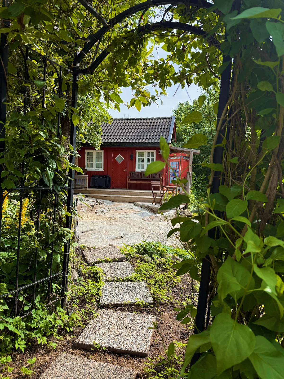 Koselig liten hytte i hage ved siden av utleiers bolig. Inneholder et lite soverom med en ganske høy dobbeltseng på 150cm adskilt fra oppholdsrommet med forheng. Hytta egner seg for 2 personer. Det er en 2seter sofa i oppholdsrommet, liten sittebenk ved spisebordet og bad. Hytta inneholder et minikjøkken med utstyr for matlaging. Veranda utenfor som hører til, med bord og to stoler. Det er ikke kjørevei fram til hytta, så bagasje må bæres fra p-plassen og opp, ca 50-60m.