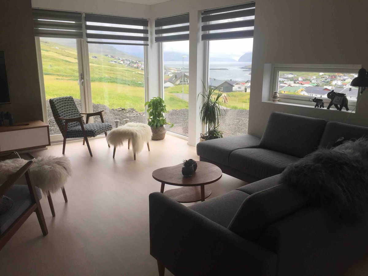 Una casa ai bordi della scogliera. Dalla zona giorno si gode di una vista diretta sulla famosa statua "The Seal Woman" e sulle montagne più ripide delle Isole Faroe. Al 1° piano ci sono cucina e soggiorno in un'unica stanza. In cucina sono presenti i normali servizi. È presente anche un bagno con doccia. Al piano superiore ci sono due camere da letto che possono ospitare 7 persone. Fuori casa c'è un piccolo balcone, dove si può godere di una vista spettacolare. Per raggiungere la casa è necessario prendere un traghetto.