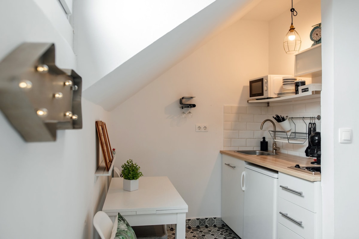 Scopri il massimo del comfort nel vivace quartiere universitario di Veszprem nei moderni V City Studios. Esplora il quartiere con facilità: negozi, caffè e negozi di alimentari nelle vicinanze. Il parcheggio è gratuito dopo le 17:00. Unità climatizzate, WiFi gratuito, un comodo angolo cottura, una comoda area salotto e un bagno privato. Nota bene: si tratta di un monolocale su due livelli con un accogliente letto a soffitto basso. Il tuo rifugio urbano è pronto e ti aspetta!