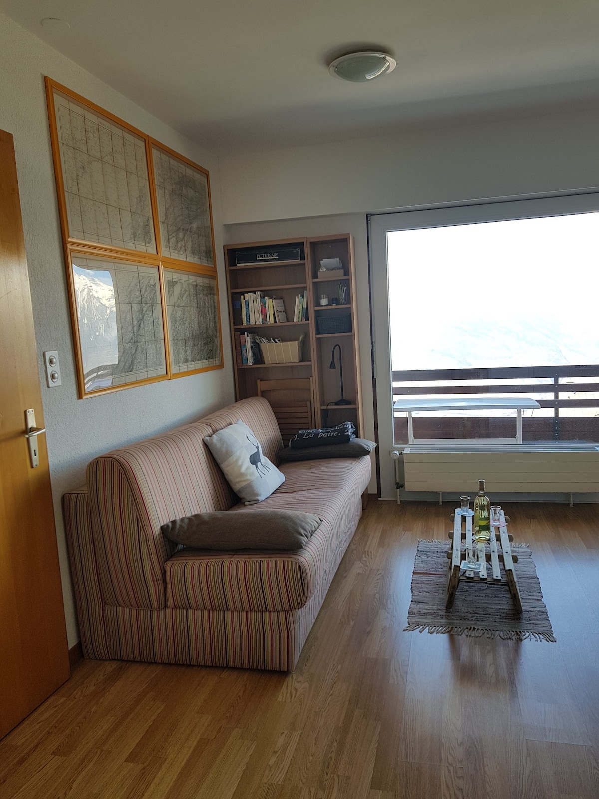 Piccolo appartamento di 2 locali, funzionale e molto ben situato, con una splendida vista sulle Alpi. Camera da letto con 2 letti, armadio e accesso al balcone. Soggiorno accogliente e ben organizzato, con comodo divano letto, ampie vetrate e accesso al balcone, vista aperta sulla valle e sulle vette alpine. L'appartamento è piccolo per 4 persone, soprattutto in stagione sciistica, con tutti i vestiti e le cose invernali, ma tutto è previsto per 4.