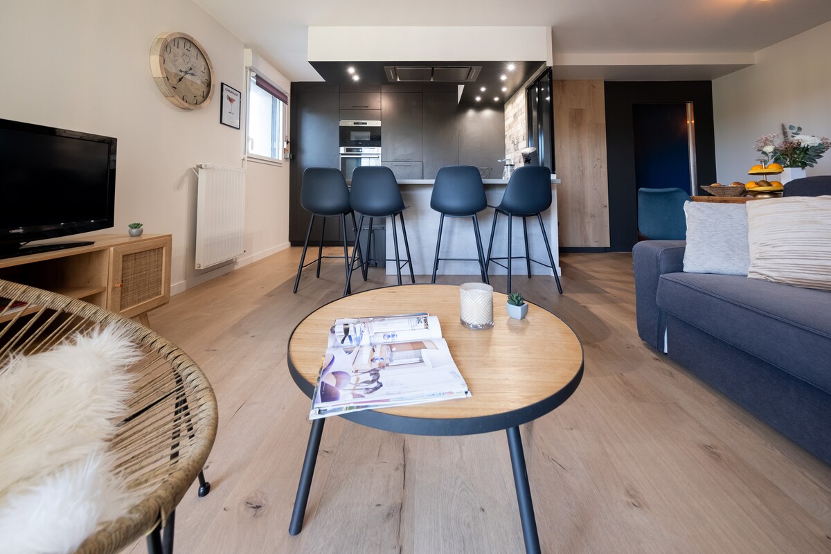 Centro di🎯 Rennes. A 🚶🏻♂️ 3 minuti a piedi da bar e ristoranti. ❤️ Perfetto per un'esperienza di coppia. 📐 50 m² con soggiorno + camera da letto + cucina. 🚘 Posto auto privato gratuito. Internet in fibra ad🖥 alta velocità. Vista 🖼️ panoramica sul centro città. Cucina 🍜 completamente attrezzata, bagno con doccia. 🛋️ Soggiorno con divano, TV 4K, Netflix, YouTube. Sicurezza 👮♂️ 24 ore su 24 nell'edificio.