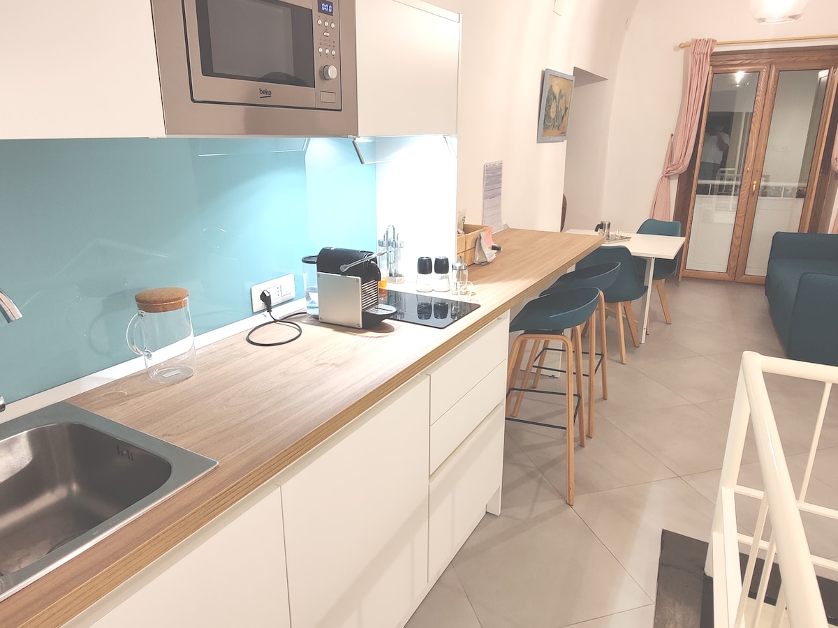The beautiful apartment was completely renovatedin 2021.The apartment is located on the second floor of an ancient building without elevator. The apartment is tastefully furnished in Mediterranean style,and includes a double bed sitting area, full kitchen marble table and 4 chairs,large wardarobe, 1 television and it is equipped with all the conforts and service, heating and air conditioning,internet wifi.The apartment overlooking the sea with stunning views of the Sorrento Peninsula