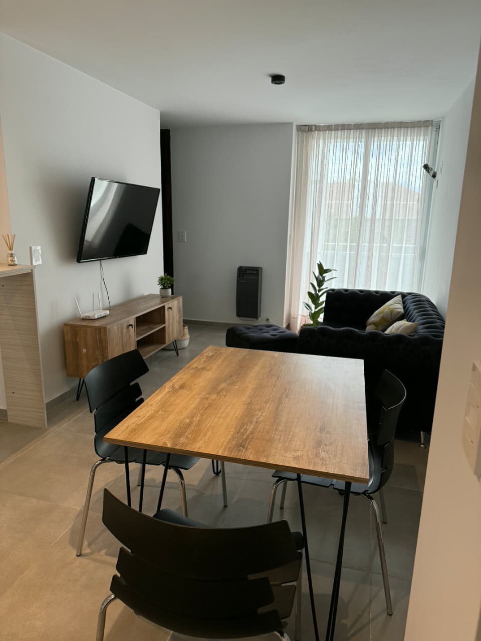 Departamento moderno y luminoso. Cuenta con un dormitorio con cama matrimonial, ropa de cama para un descanso reparador. El living-comedor es amplio y acogedor, con sillĂłn, Smart TV, mesa con sillas y entrada de luz natural. La cocina integrada es funcional y práctica para estadĂas cortas o prolongadas. El edificio ofrece excelentes amenities, terraza con pileta, solárium con reposeras y asador con mesa, sillas y bacha, ideal para disfrutar del verano y compartir momentos al aire libre.