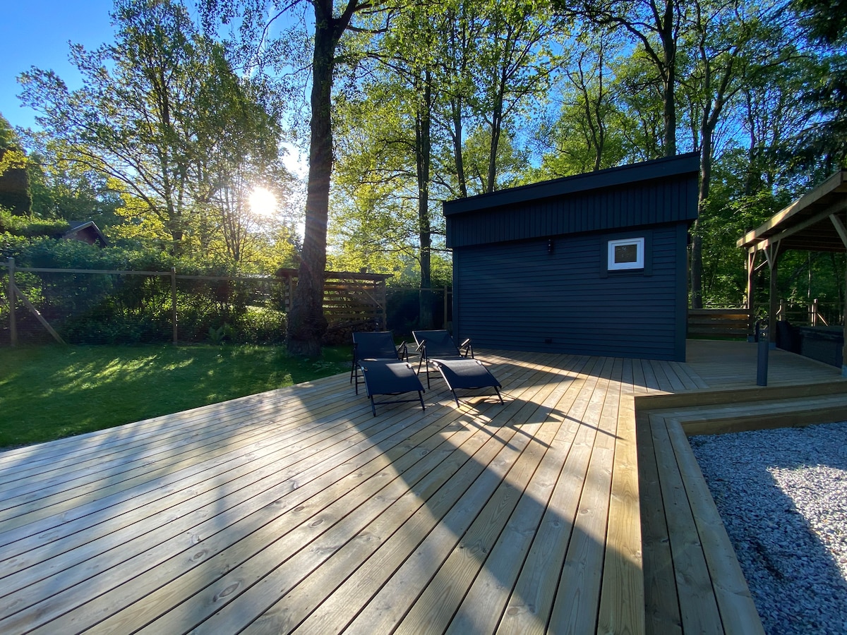 Un cottage con sauna, vasca idromassaggio e caminetto all'aperto nella foresta. Cottage con sauna, vasca idromassaggio e caminetto all'esterno. Moderna proprietà recentemente ristrutturata di alto livello. La struttura è composta da un cottage principale e un cottage spa più piccolo con area barbecue pavimentata associata e vasca idromassaggio. Tetto con schermo e chalet intorno alla zona barbecue, vasca idromassaggio e grande terrazza in legno intorno. Ambiente forestale idilliaco nel cuore della Skåne vicino a Ringsjön, con possibilità illimitate di pesca, escursioni, aria fresca, nuoto, escursione e relax.