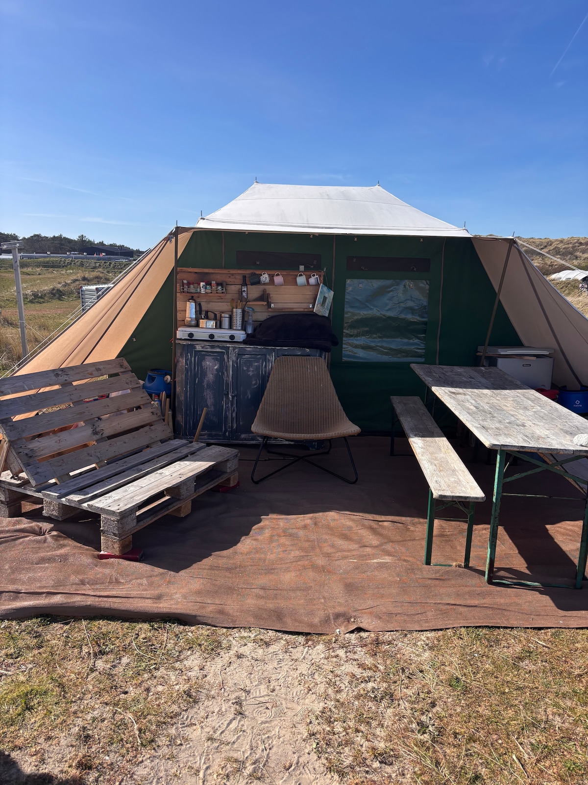 Tenda completamente arredata in modo accogliente. Tenda da notte completamente chiudibile, resistente alle intemperie, con grande tendalino, utilizzabile in due parti per 4 persone. 1 letto matrimoniale (con materassi) e 2 materassini. Incl. stufa a gas x frigorifero x pannello solare per ricaricare telefono x tablet. La tenda si trova nel campeggio Stortemelk, settore rosso. Posizione ideale e soleggiata con sufficiente privacy grazie a frangivento a 10 m dall'ingresso della spiaggia. Non affittiamo a giovani di età inferiore ai 22 anni (questo a causa delle regole del campeggio).