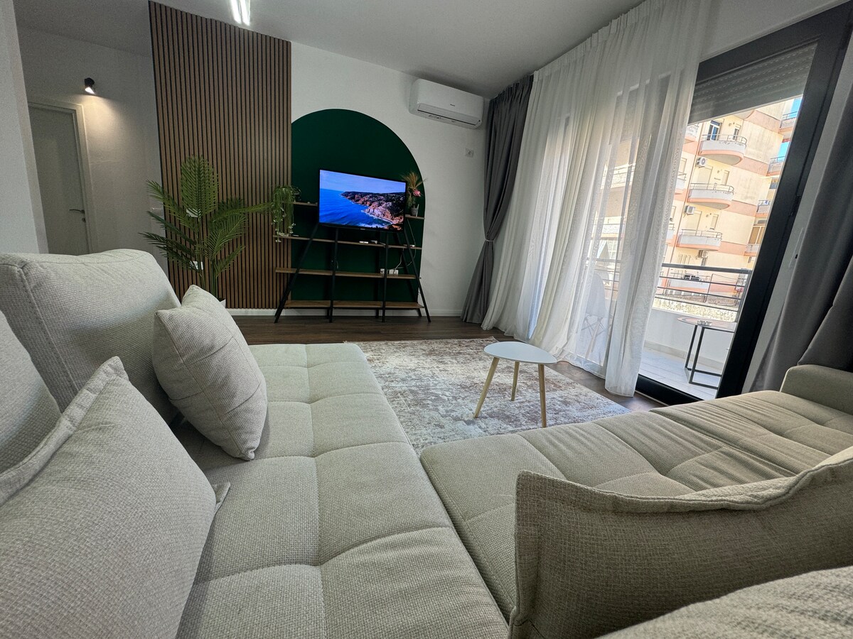 Incantevole appartamento a Valona, a pochi passi dalla spiaggia! Perfetto per famiglie, amici o nomadi digitali. Questo luminoso e confortevole appartamento con 2 camere da letto e 2 bagni dispone di un balcone privato con una splendida vista sul mare. Goditi uno spazio completamente attrezzato, WiFi ad alta velocità con un potente router, accesso a caffè, ristoranti, negozi, campi da tennis o un giro in bicicletta lungo il Lungomare (la costa). Dal nostro appartamento si raggiungono facilmente famose spiagge come Dhërmi, Livadh, ecc.