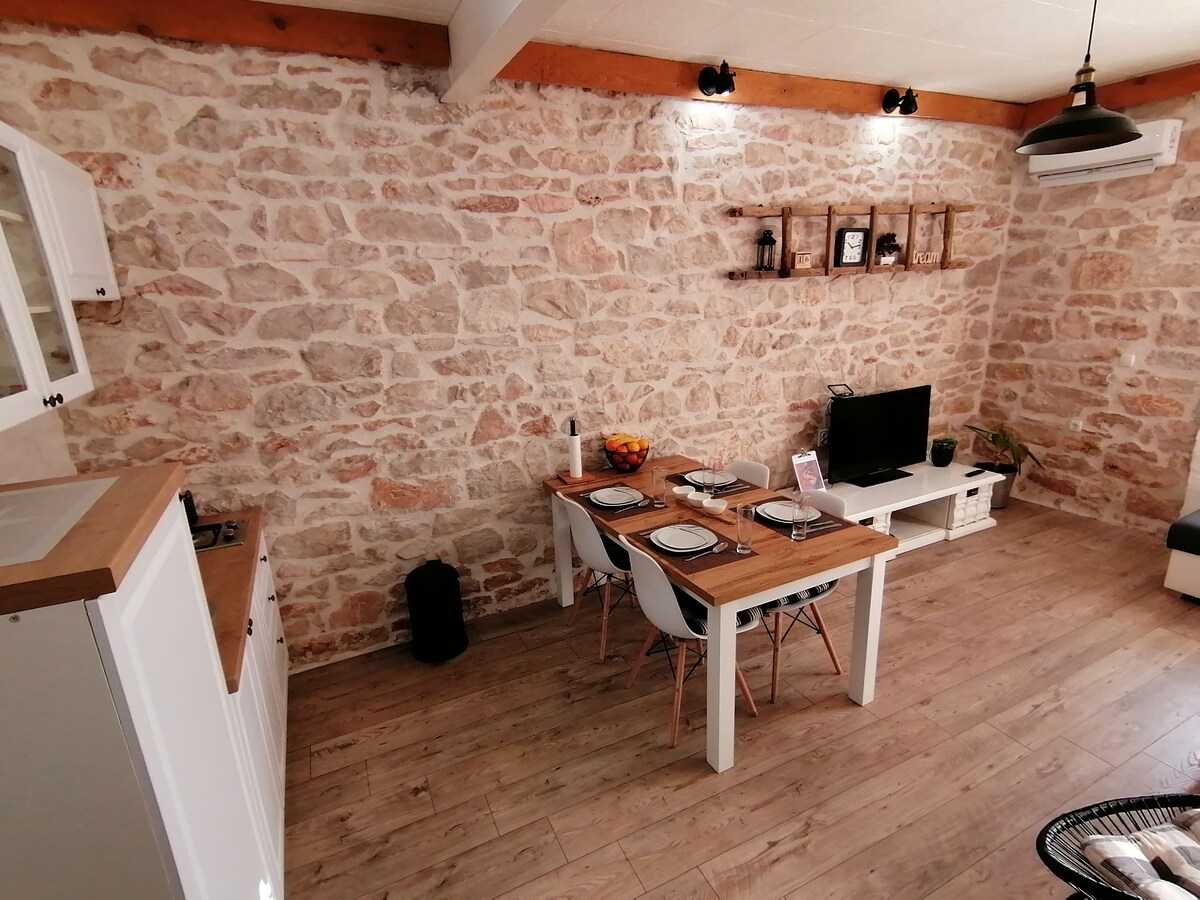 HAI UN APPARTAMENTO DI 50 Mquest. Con bagno, cucina, soggiorno e patio. La cucina è attrezzata. C'è un divano nel soggiorno. Parcheggio privato. Barbecue. Nelle vicinanze ci sono negozi, ristoranti, panetterie e un mercato. La cosa più importante è che il Parco Naturale della Krka, la cascata, Arenama Burnum, Sebenico, Vodice, Trogir. La proprietà è sulle vespe sul pacco da 3000m. Solo case stoiećia nella natura a 3 minuti da Skradin.