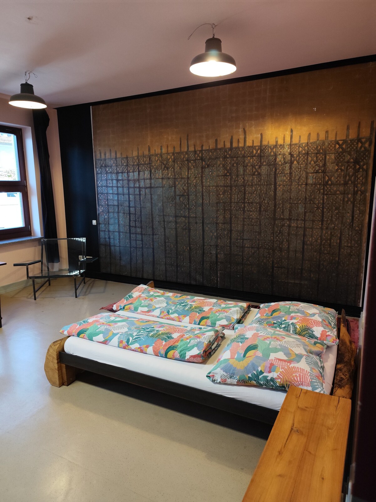 Benvenuto nella tua casa speciale! La camera si trova in un'ex caserma statunitense, oggi qui troverai un mix di arte, socialità e vita direttamente ai margini del bosco. La camera ha un comodo letto matrimoniale, un piccolo angolo cottura e un bagno con doccia e servizi igienici. La posizione è tranquilla ma ben collegata con i negozi e l'autostrada. Perfetto per brevi viaggi, viaggi di lavoro o semplicemente una piccola pausa. Non vediamo l'ora di darvi il benvenuto!