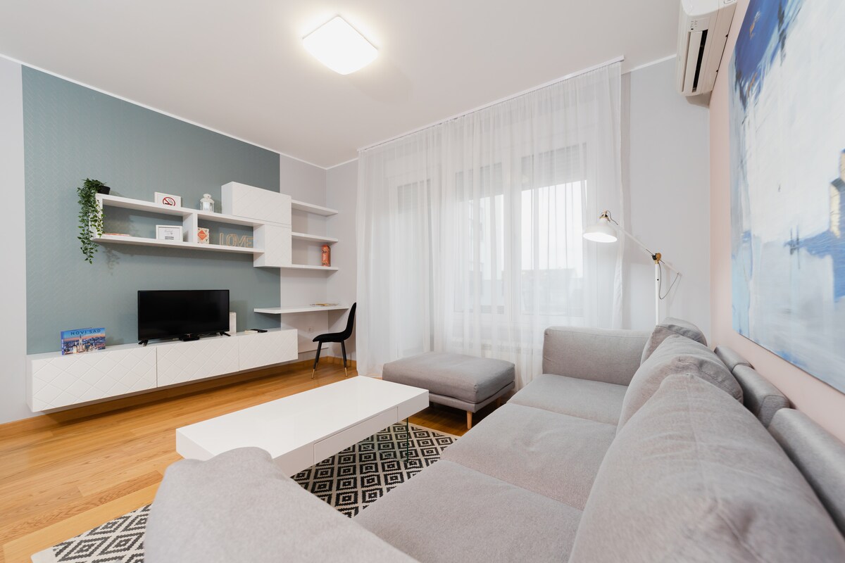 Relax in this tranquil, elegant space. The apartment is completely renovated, modern, functional, aesthetically pleasing. It is located in the urban part of Novi Sad at Liman 3, near the Danube, with very well connected bus and taxi lines to all parts of the city. The apartment is about 5 km from the Petrovaradin fortress and the city center. Nearby there are supermarkets, quiet restaurants, hair salons. There is a large free parking lot in front of the building itself. It's yours to enjoy!