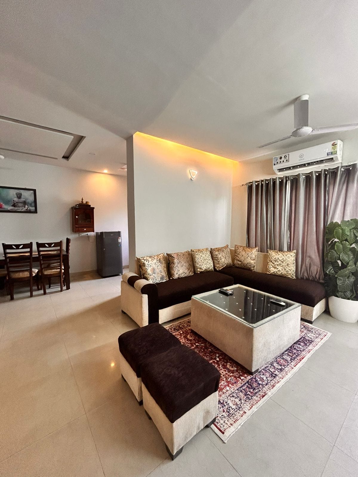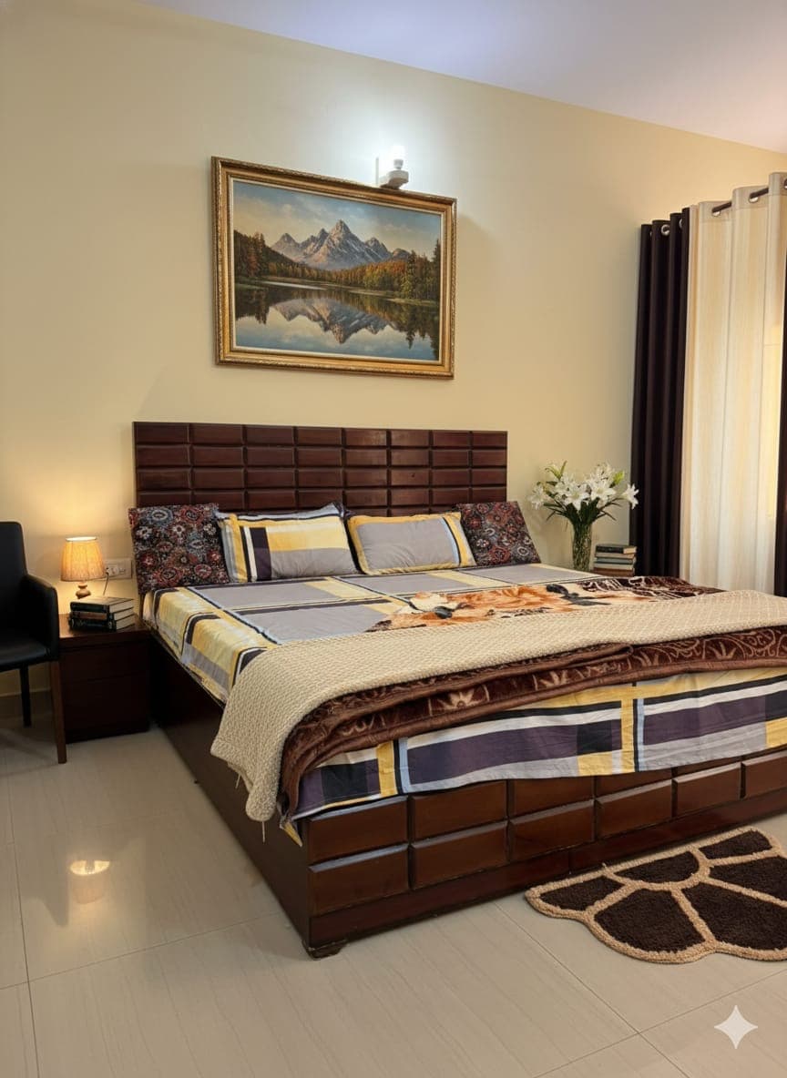 1 Bedroom Has 1 Double Bed Suitable For 3 Members, Window AC Is Available In Bedroom 1 Living Room Has 1 Deewan Cum Bed Suitable For 3 Members (Non Ac ) Living Room & Bedroom Both Connected With 1 Washroom In Kitchen fresh Drinking water & basic cooking utensils will be provided, Cleaning will be done from yourside Power Back Up Is Available 24*7 On Inverter TV, AC & Geyser will not work WiFi & washroom toiletries provided Distance from Isckon temple 2.5 km Scooter On Rent Available