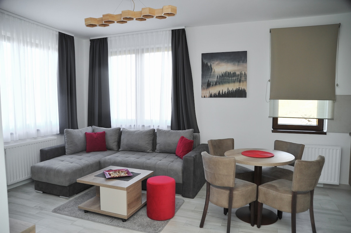 Opustite se sa porodicom u ovom mirnom smeštaju.Apartman se nalazi , na drugom spratu u novoj stambenoj zgradi koja poseduje sopstveni parking kao i lift. Sa terase se pruža prijatan pogled na obližnju šumu.Od centralne fontane na šetalištu apartman je udaljen 1km. U neposrednoj blizini nalazi se aqua park vrnjačke terme, panoramski točak i luna park kao i banjski izvor i hotel Slatina.
