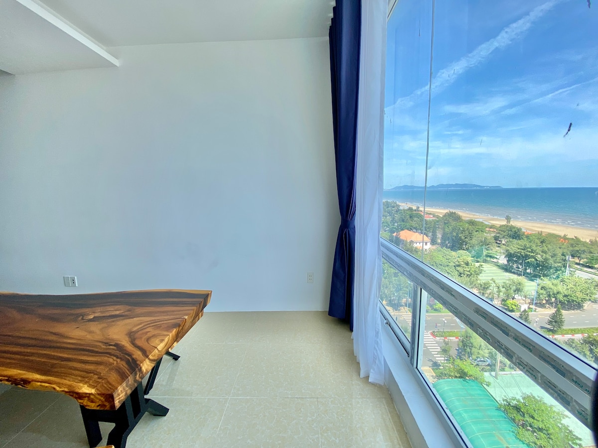 Minimalist, fully furnished 1BR apartment on the 15th floor with spectacular sea views. Ideal for couples or families with one child under 5. Perfectly located beside the Back beach (Thuỳ Vân beach). Estimated walking times to nearby amenities: - 2 minutes to reach the beach across the street - 5 minutes to the nearest 24/7 convenience store (GS25) - 8 minutes to the nearest supermarket (Lotte Mart) Fast elevators. Free Netflix. We also have one motorbike available for rent.