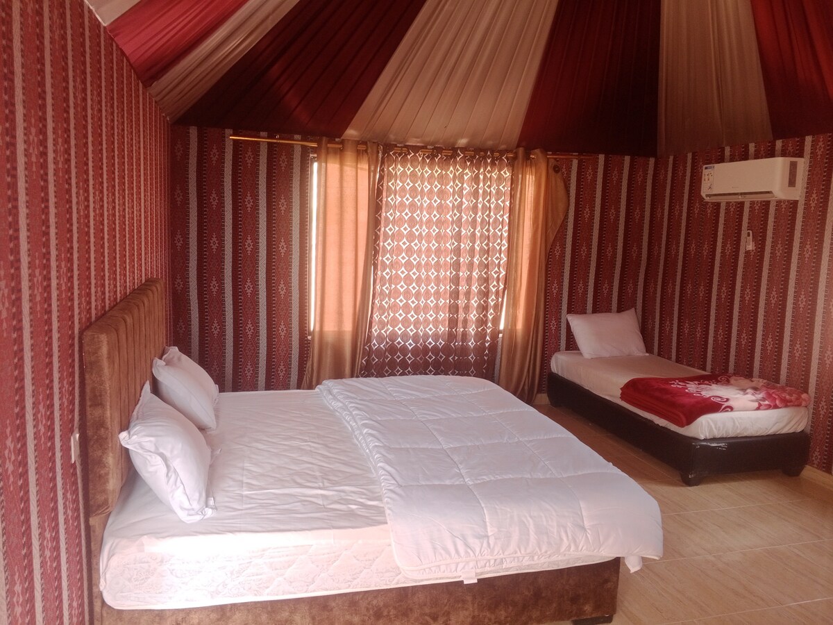 Trascorri una notte in una lussuosa tenda beduina nel cuore del deserto del Wadi Rum Questa lussuosa tenda è composta da 3 letti singoli in una stanza privata con bagno e una finestra panoramica che conduce alla terrazza privata con una vista mozzafiato sul deserto. Vi saranno forniti asciugamani, shampoo e acqua gratuita. Include la colazione nella sala comune. Il trasferimento dal villaggio è 10JD/persona se non prenoti un tour con noi.