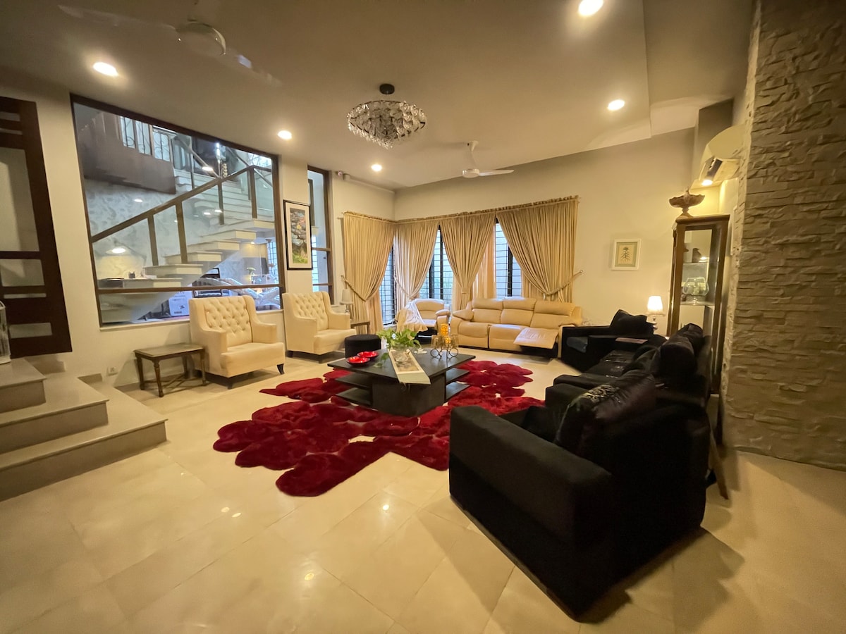 A beautiful two story (Ground & First Foor)with three bedroom house with drawing room, separate dining and a TV lounge. Located in a great community fully secured, ideal for short- or long-term stays, for small as well as big families upto 8 persons! Experience ease of access to anywhere around the city as we are located close to all and when you're not relaxing, experience our high-speed WiFi up to 30 mbps to get work done or enjoy a movie on Netflix or Prime Video in comfort.