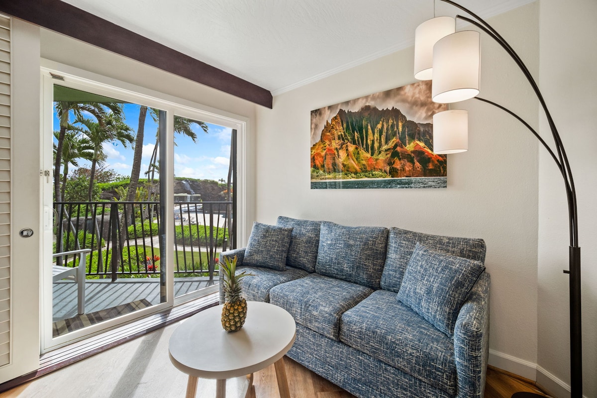 Questa è la suite con una camera da letto perfetta! Ha una vista sull'oceano e si affaccia sulla piscina! Goditi il caffè del mattino o i cocktail al tramonto sulla veranda! I servizi in camera includono frigorifero/congelatore, macchina per il caffè Keurig (caffè e tè forniti dall'host), scrivania, asciugacapelli, asciugamani, shampoo, balsamo e sapone. I servizi di lavanderia sono in fase di ristrutturazione 10/1/25, ma uno è nelle vicinanze Si tratta di una suite presso il rinnovato Outrigger Kauai Beach Resort, situato a soli 10 minuti dall'aeroporto di Lihue.