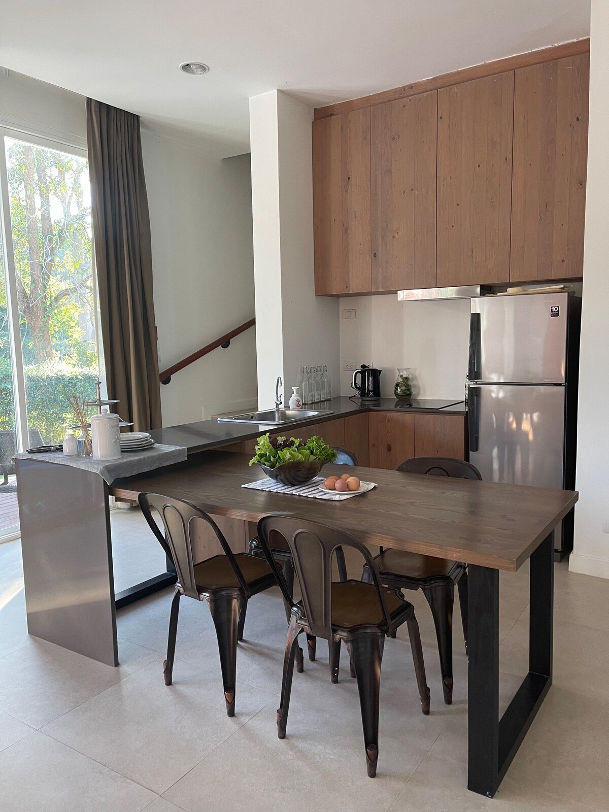 Entra in questa incantevole baita, una splendida casa in legno di teak con 100 m² di spazio elegante. Goditi la vista mozzafiato sul Parco nazionale di Khao Yai dal tetto. Rilassati e goditi servizi come una TV da 50 pollici, un bagno con doccia a pioggia e una cucina all'aperto. Cena al tavolo immerso nella natura o sulla terrazza circondata da un tranquillo giardino. L'ampia terrazza sul tetto è anche il tuo rifugio per osservare le stelle con un bicchiere di vino o un buon libro, immergendoti nell'atmosfera unica e nella bellezza naturale.