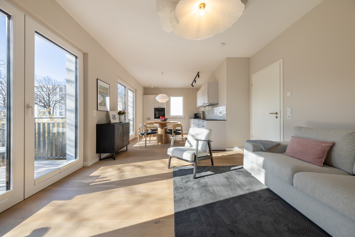 Modern eingerichtet und lichtdurchflutet wartet diese 3 Zimmer Wohnung auf den Ostseeliebhaber. Die Wohnung ist erst 2024 in einem Neubau entstanden, die Lage ist am südlichen Ende des Alten Stroms. Eingerichtet ist diese Wohnung mit eleganten und komfortablen Möbeln wie einem großen Sofa und einem runden Teak-Esstisch, vom Wohnzimmer gelangen Sie auf den Balkon mit Südost-Ausrichtung. In 2 Schlafzimmern kommen bis zu 4 Personen bequem unter. Zum Strand sind es ca. 1000m.