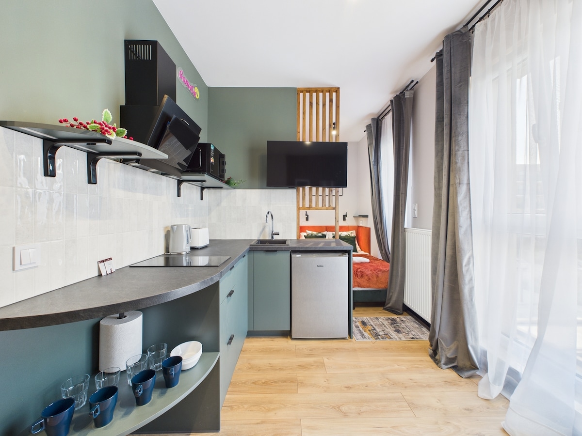 Ti invitiamo agli appartamenti Sadyba, in un'area tranquilla e ben collegata. L'appartamento è composto da un soggiorno, un angolo cottura con zona pranzo, una zona notte e un bagno con vasca. L'appartamento è arredato in modo funzionale e dotato delle attrezzature necessarie: accessori per la cucina, frigorifero, ferro da stiro, asciugatrice, TV. Posto auto, internet e reception aperta 24 ore su 24. Colazione al Breakfast Restaurant, tutti i giorni dalle 7 alle 10. Buffet e piatti su misura.