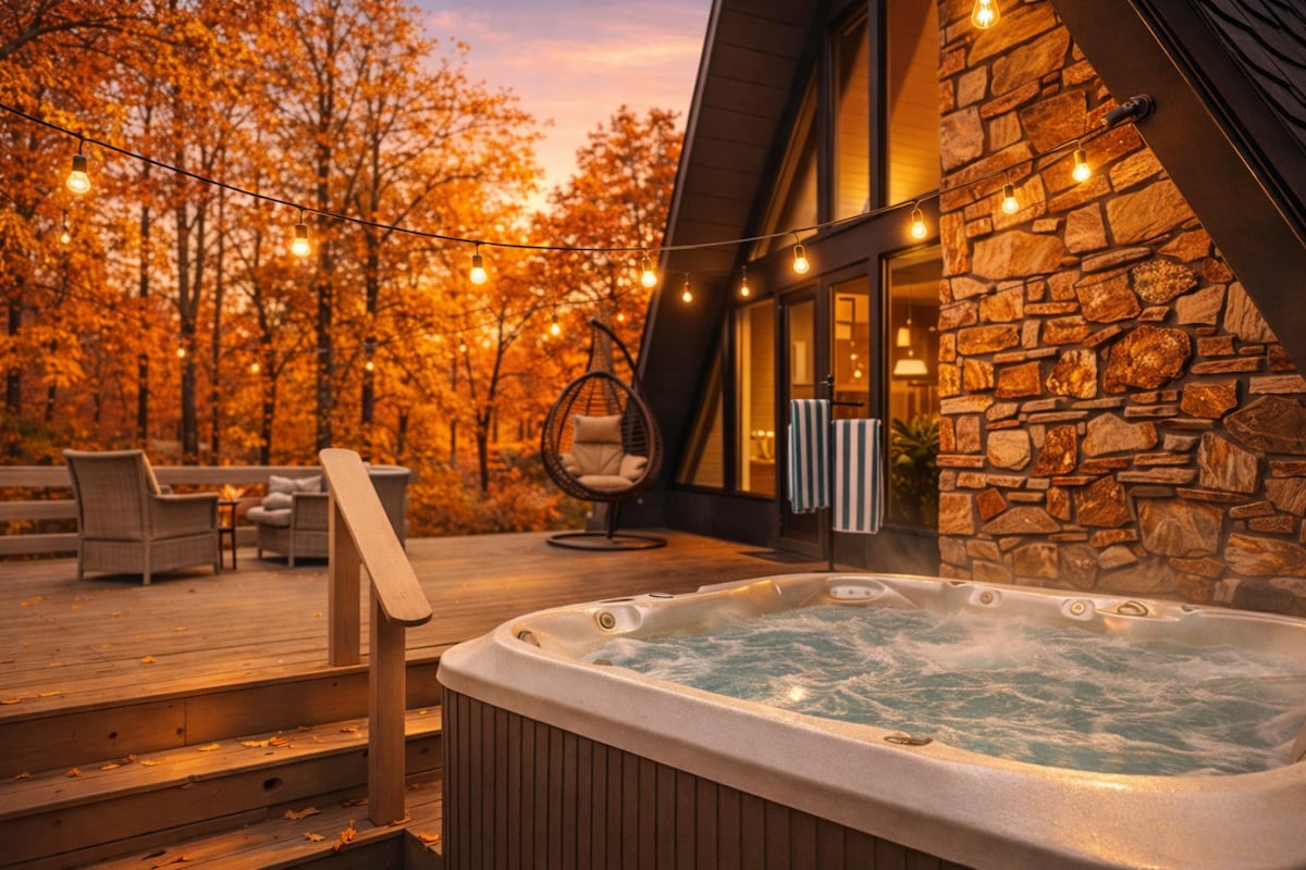 Vasca idromassaggio sotto le stelle, casa a forma di A con camino e parete di finestre, oltre a un teatro privato, il tutto per soggiorni indimenticabili. ✔ Vasca idromassaggio privata tra gli alberi ✔ Imponente casa con tetto a triangolo, camino e parete di finestre ✔ Sala cinema privata con audio surround + PS5 ✔ Area giochi con air hockey e calcio balilla ✔ A pochi minuti da Stevens Point, sentieri, birrerie e Granite Peak