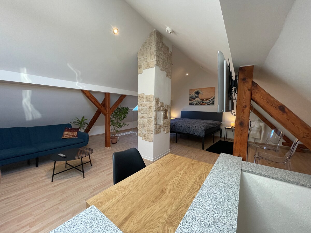 Benvenuti in questo moderno appartamento mansardato nel centro storico di Weiden. Godetevi la splendida vista, la cucina abitabile a vista e l'arredamento di alta qualità. Scoprite il fascino autentico del centro storico con tutte le attrazioni, i ristoranti e i negozi e il mercato settimanale a pochi passi. Il vostro rifugio perfetto per un soggiorno indimenticabile.
