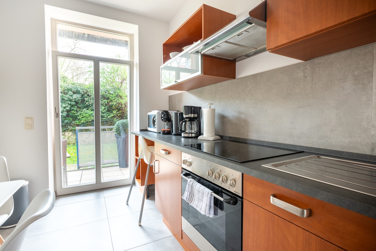 Ti aspetta un luminoso appartamento di 3 locali in una bella posizione! L'appartamento al piano terra recentemente ristrutturato ha un terrazzo e biciclette a noleggio (da noleggiare per 10,00/giorno/bici in aggiunta). Costruito nel 1926, questo condominio ben tenuto si trova nella parte ovest del centro di Weimar, facilmente raggiungibile a piedi in 15 minuti. Una stazione degli autobus è nelle immediate vicinanze. Il nuovo Bauhausmuseum e il famoso Weimarhallenpark sono raggiungibili a piedi in circa 10 minuti a piedi.