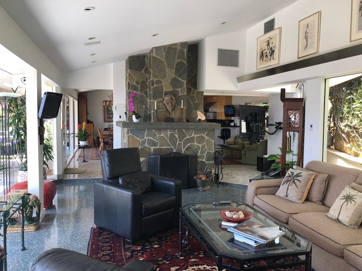 Rifugio sereno, immerso nelle colline di Hollywood; zen spirituale, oasi privata. Sensibile e alla moda, con una moderna influenza asiatica/balinese, perfetta per l'intrattenimento al coperto/all'aperto. Ogni bagno offre pace e relax. Ampia camera da letto matrimoniale con caminetto e bagno interno, vasca idromassaggio e doccia a pioggia. Rilassati nella spa riscaldata all'aperto. Questo alloggio evoca una risposta emotiva. Inoltre, accettiamo animali domestici. La nostra casa può ospitare fino a 8 persone, non sono ammessi ospiti o visitatori aggiuntivi.