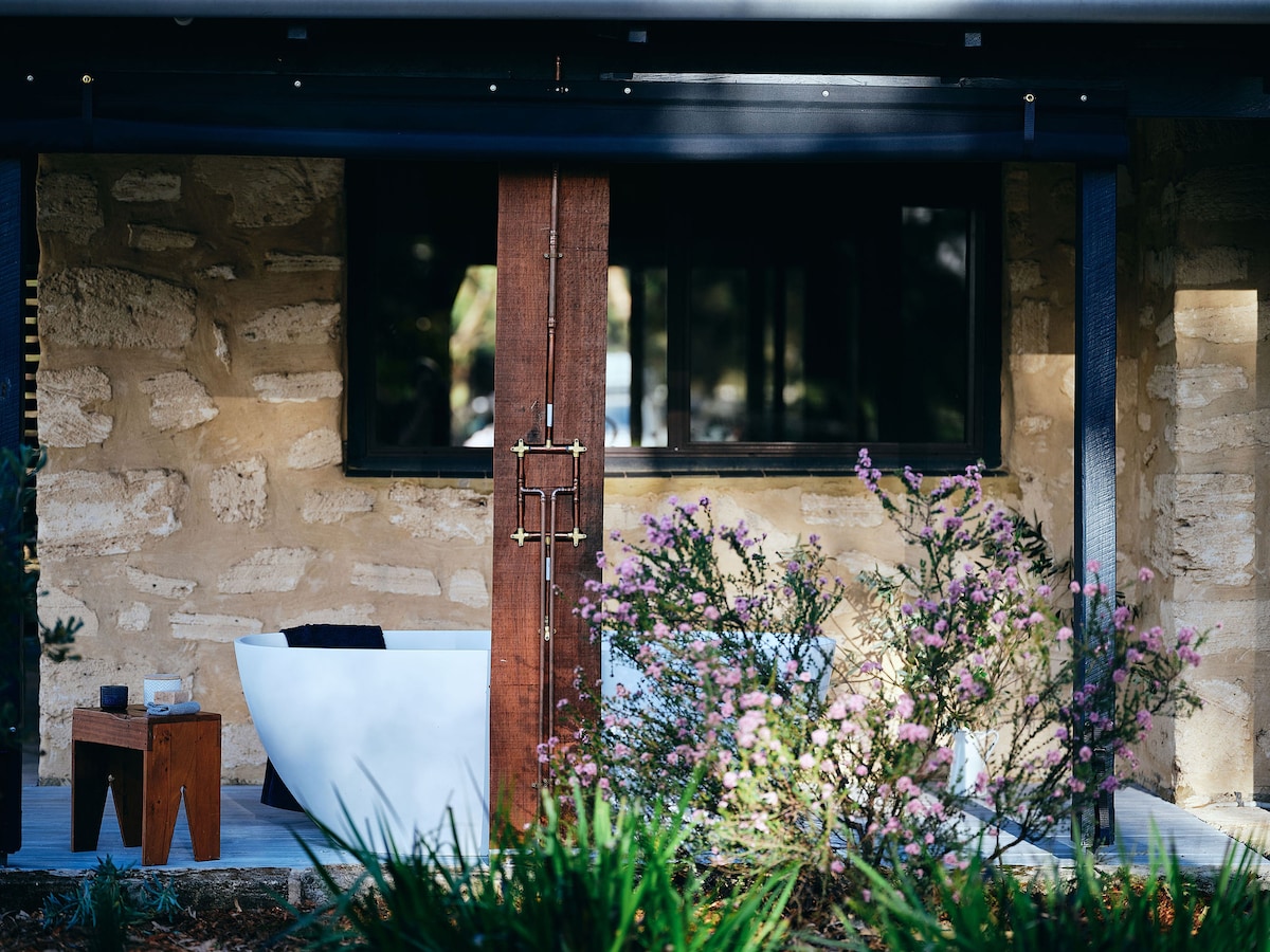 La posizione migliore a Margaret River. A breve distanza in auto dalla città o dalla spiaggia dalla nostra fattoria. Il nostro bungalow in pietra calcarea con 2 camere da letto è uno dei preferiti, con la sua esclusiva vasca da bagno esterna in pietra e la vista sul vigneto. Perfetto per una coppia, un piccolo gruppo o una famiglia. Design solare passivo e stile rustico moderno realizzato con materiali naturali; pareti in pietra calcarea, pavimenti in pietra e legno. Fresco d'estate e accogliente d'inverno, grazie al caminetto a legna. La tariffa base è per 2 persone, con un costo aggiuntivo per ospiti extra fino a un totale di 5 persone, inclusi i bambini.