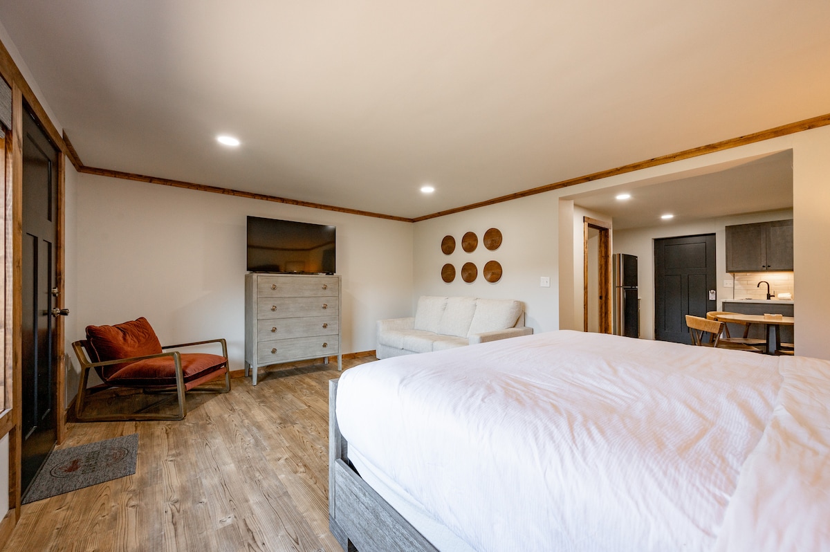Comfort and convenience from every angle, this poolside suite retreat provides you access to everything in just a few short steps. Spread out in the plush King bed and rest up for your next lake adventure. This suite also has a Queen sleeper sofa for additional sleeping space. Equipped with a full kitchen to cook meals, Smart TV, and a luxurious bathroom with walk-in shower and quality bath products. Walk right out to your private patio for two and take in the fresh mountain air before heading