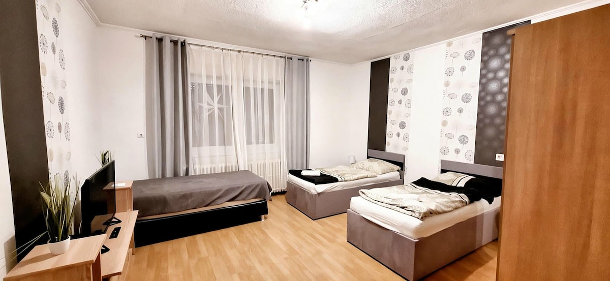 .Az apartmanban 3 külön hálószoba található, melyek külön-külön foglalhatók, így rugalmasan alkalmazkodik rövid és hosszabb tartózkodáshoz. Közös használatú: Teljesen felszerelt konyha, Ebédlő 2 fürdőszoba WC-vel További előnyök: Gyors Wi-Fi Nagy, zárt udvar parkolási lehetőséggel. Kényelmes és otthonos környezet, ahol a vendégek jól érezhetik magukat, akár munkavégzés, akár pihenés céljából.