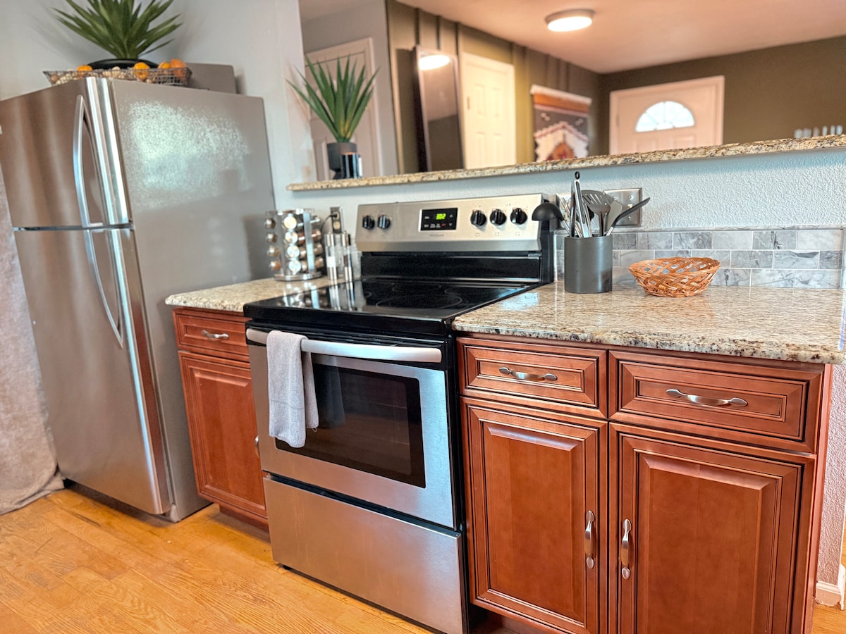 La tua casa lontano da casa! Ti diamo il benvenuto nella nostra nuovissima casa indipendente a West Arvada! Questa casa include soffitti a volta, una fantastica cucina con un ampio soggiorno a pianta aperta, lavatrice/asciugatrice, elettrodomestici nuovissimi, armadi con chiusura ammortizzata, recinzione completa e ingresso privato, cortile anteriore e posteriore. Il cortile offre un'oasi rilassante per godersi un bel focolare, un divano e, naturalmente, ammirare il mini pollaio con le galline!