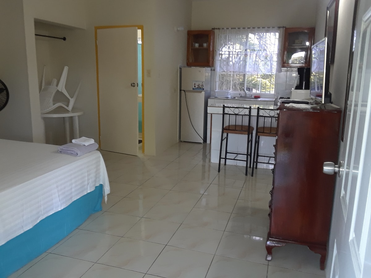 Rilassati con una splendida vista sul Mar dei Caraibi. Siamo un po' fuori dai sentieri battuti, sei abbastanza vicino alla città di Negril e alla spiaggia di 11 km. Eppure sei lontano dalla frenesia e puoi goderti un soggiorno tranquillo e riposante. Questo monolocale comprende angolo cottura, bagno e veranda privata. Goditi le passeggiate locali o trascorri le giornate rilassandoti a bordo piscina. Ti senti attivo? Mettiti in forma nella nostra palestra aperta/coperta di Muay Thai/ Boxing, che include anche pesi liberi.