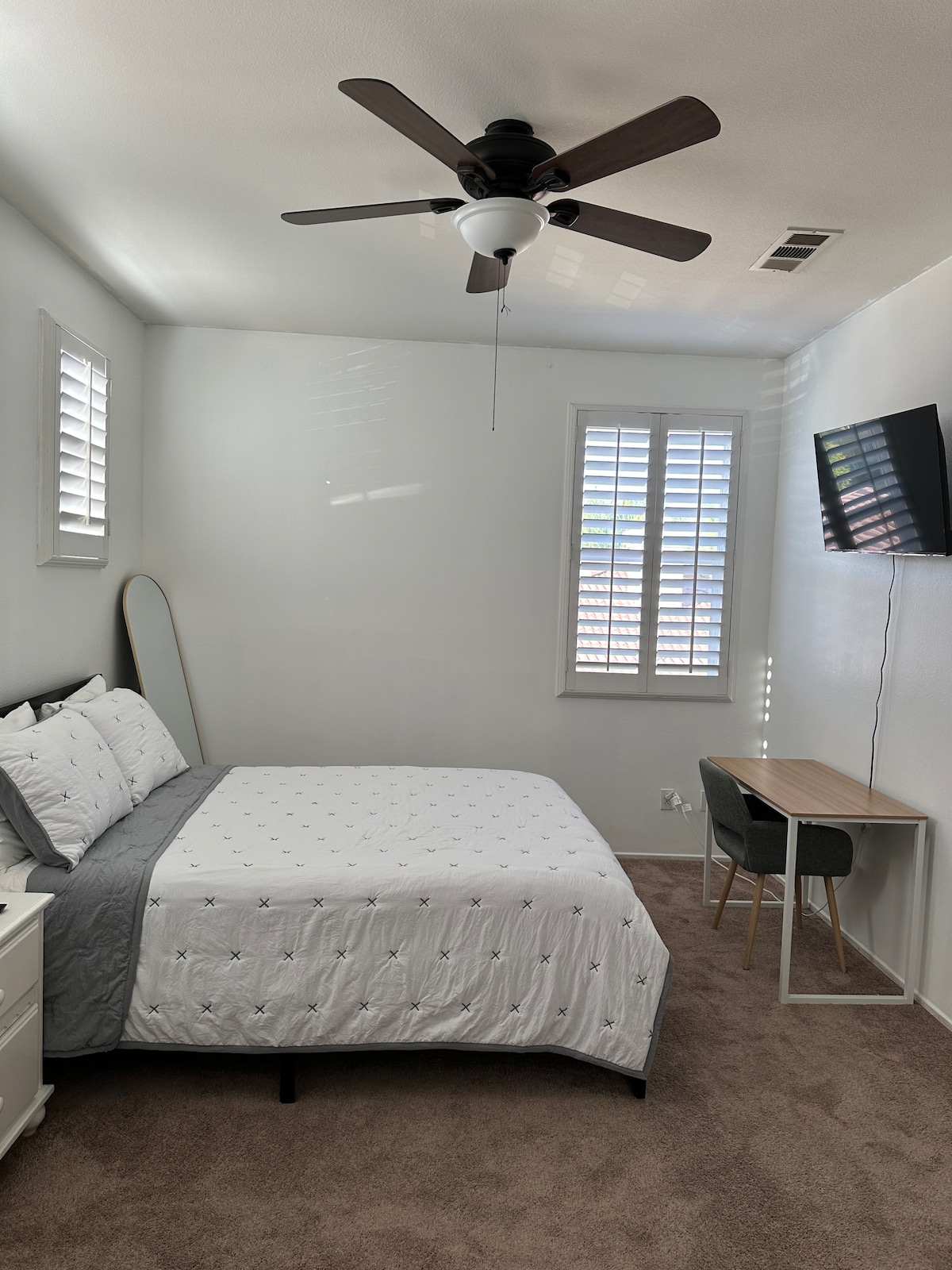 Bring your family, friends & pets to stay at this spacious, stylish home. The entire place will be yours with access to a fenced yard for your pet with a doggy door inside, full kitchen, Office space, 3 bedrooms each with private bathrooms, fully equipped laundry room, + EV charging & Living space with a couch that sleeps 2! What to do: 20 min from Temecula Wineries Hot air balloon Pechanga Casino K1 Racing Track Ziplining Coachella 1 hr radius : Los Angeles, San Diego and Palm Springs