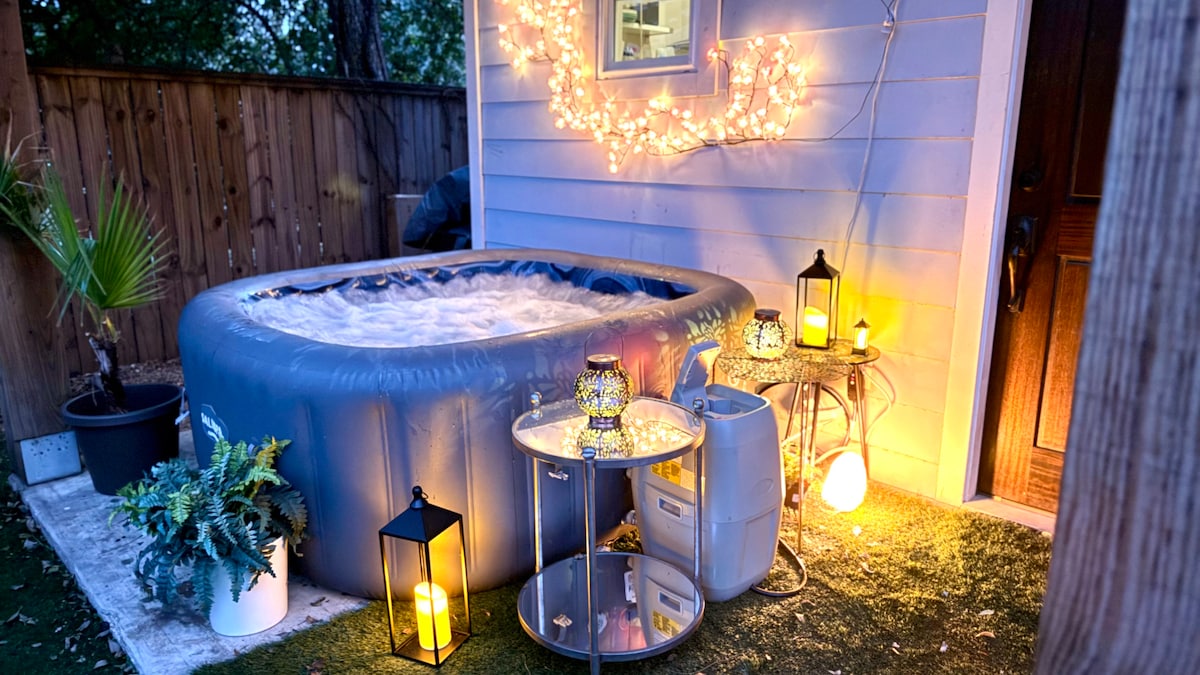 Vasca idromassaggio, patio in giardino, barbecue, braciere