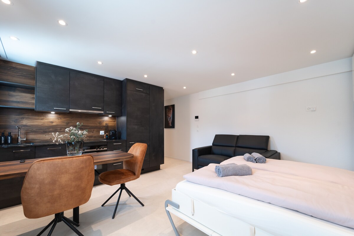 Das voll ausgestattete Apartment verfügt über eine grosszügige Nasszelle, eine moderne Küche mit Induktionsherd, Kühlschrank, Backofen und Mikrowelle sowie diverse weitere Annehmlichkeiten wie bspw. einen LAN- und WLAN-Zugang und einen 42 Zoll Fernseher. Lichtdurchflutete Räume sowie eine Komfortlüftung sorgen für ein optimales Wohnklima. Das Apartment kann nur für touristische Zwecke benutzt werden und nicht als fester Wohnsitz und nicht als Wochenaufenthalter.