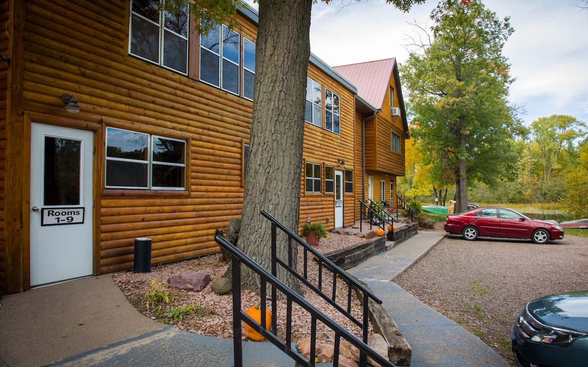 Dipingi e tronchi della storia di Knapp, Stout e Company. Al suo primo posto è stata la più grande opera di logging del paese. Dai un'occhiata al nostro museo dei tronchi nella North Hall. 2 ° piano, 2 letti queen-size, 1 letto singolo, cucina, vasca/doccia. Animali domestici ammessi. In estate, rilassati nella nostra zona balneabile privata o prendi una delle barche a remi gratuite, canoe, kayak o barca a remi per una divertente avventura sul lago. I pontoni sono disponibili per l'affitto.