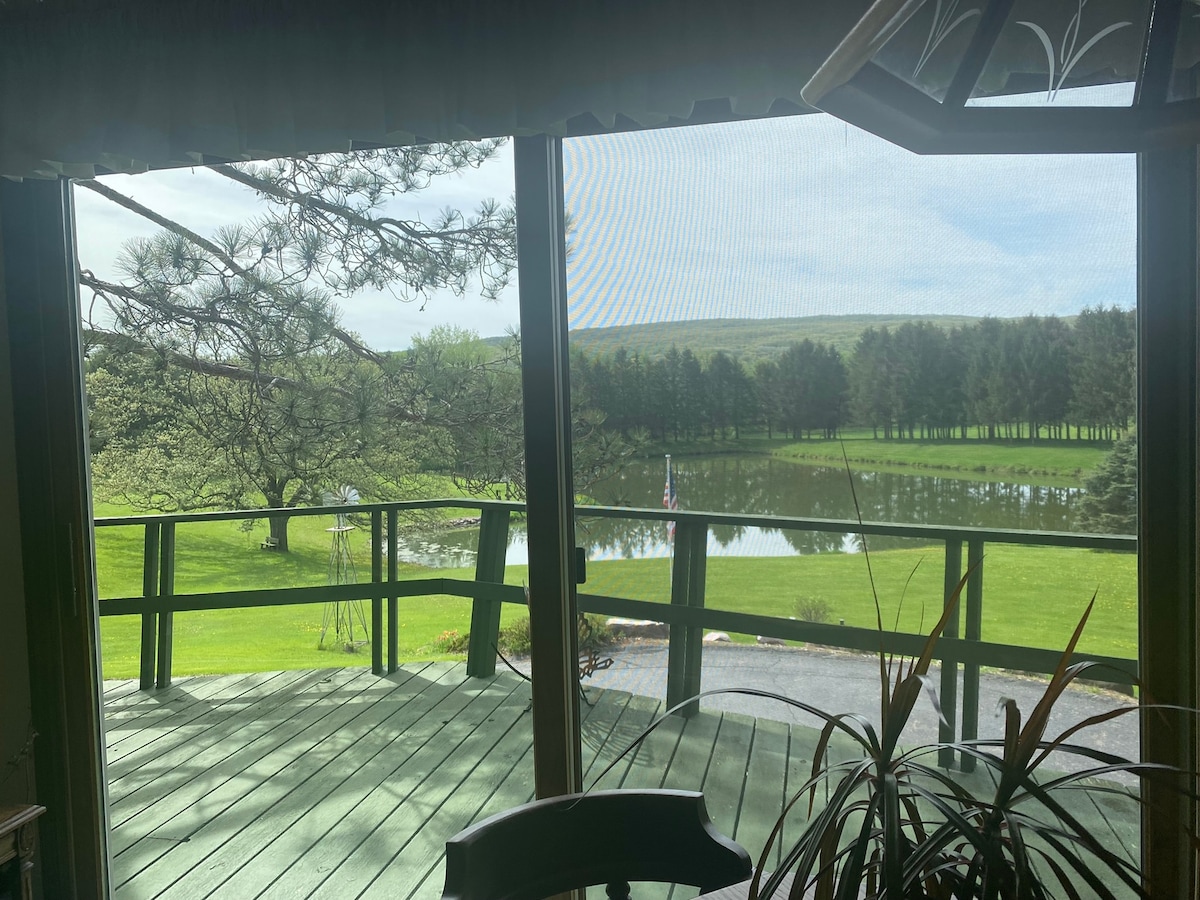 Situato in fondo al lodge, vicino al bosco. Goditi il Trillium e altri fiori primaverili, oltre a ciò che porta ogni stagione. Potresti intravedere un'aquila che pesca. 1 ° piano, 1 letto king-size, vasca idromassaggio, caminetto, forno a microonde, frigorifero, vasca/doccia, nessuna STANZA PER ANIMALI DOMESTICI In estate, vieni a rilassarti nella nostra piscina privata o prendi uno dei pedalò, canoe, kayak o barche a remi gratuiti per una divertente avventura sul lago. I pontili sono disponibili per l'affitto.