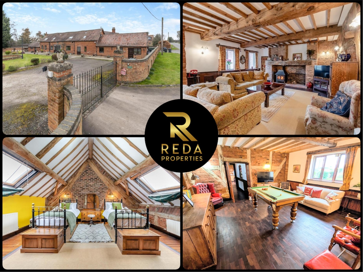 Si prega di vedere la nostra ultima foto per le offerte. Benvenuti a Pritams Gate. Un grande fienile indipendente del XVIII secolo ristrutturato secondo standard molto elevati, circondato da terreni rurali, che offre una bella fuga calda e rustica dalla frenesia della vita quotidiana, a meno di 10 minuti dalla M42. Con 2 annessi indipendenti al piano terra, ciascuno con angolo cottura, e altre 5 camere da letto e 2 bagni nella casa principale, Pritams Gate è l'ideale per riunioni di famiglia, professionisti, visitatori del NEC e appaltatori