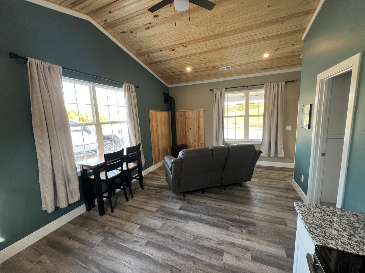Ambiente di campagna molto riservato a soli 3 km a sud dell'Interstate 70. Probabilmente ti godrai alcuni avvistamenti di fauna selvatica. Bella terrazza privata. Spazioso chalet con cucina completa. Il letto a scomparsa nel soggiorno (molto comodo) offre un letto matrimoniale extra, se necessario; altrimenti non è d'intralcio. La connessione internet era debole, quindi ha influito su alcune recensioni, ma ora è velocissima. Destinazioni nelle vicinanze sono Cedar Lake Winery, Big Joel's Safari, Long Row Lavender Farm e Pumpkins Galore.