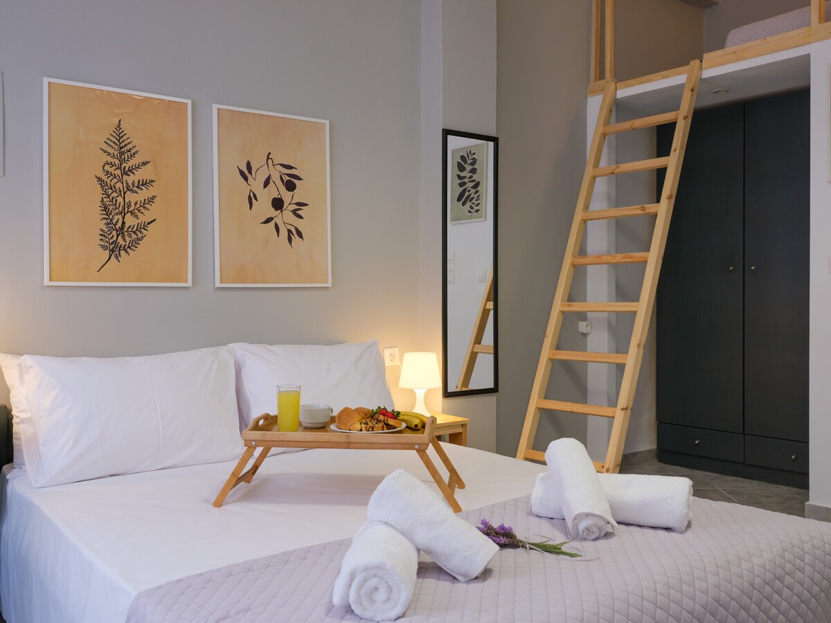 Size: 70 sq.m. Comfort Loft Studio offers a comfortable stay. At its lower level has a double bed which is isolated by sliding partitions. It is elegantly furnished with a fully equipped kitchen, dining room, living room with large comfortable sofa, bathroom and a small balcony. At its upper level has a bedroom with double bed and spacious bathroom. It is part of a modern apartment complex in the heart of the city that ensures a relaxing and high quality accommodation throughout the year.